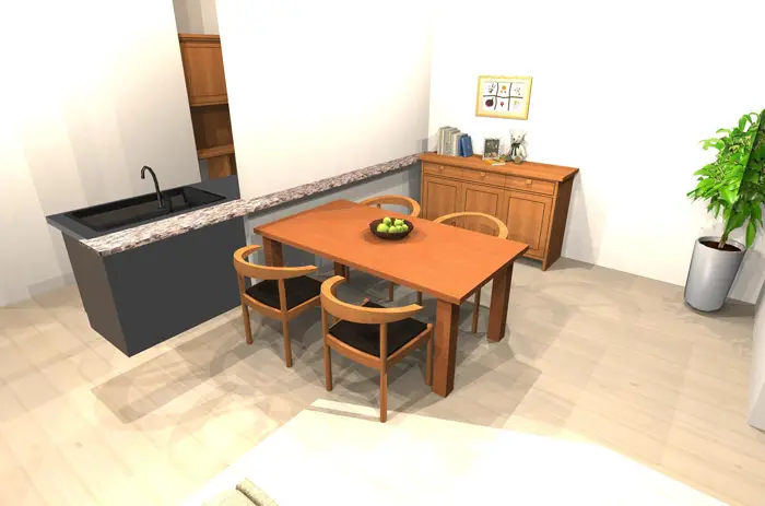 そこでまずはテーブルのサイズやレイアウトなどもスムーズにイメージできるよう、ご新居の間取り図からCGによる3Dシミュレーションを実施。