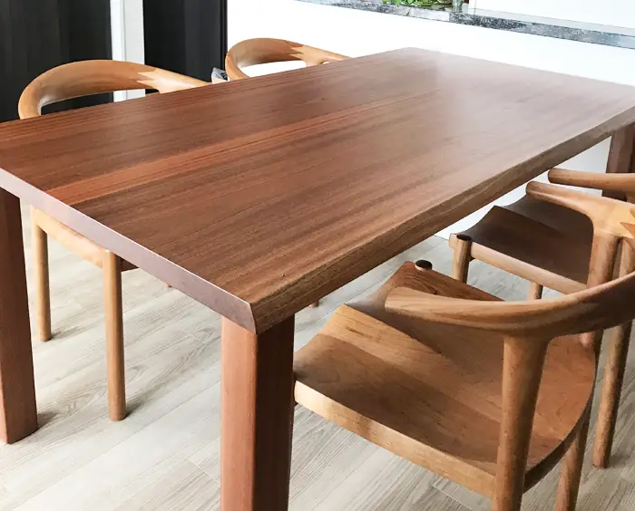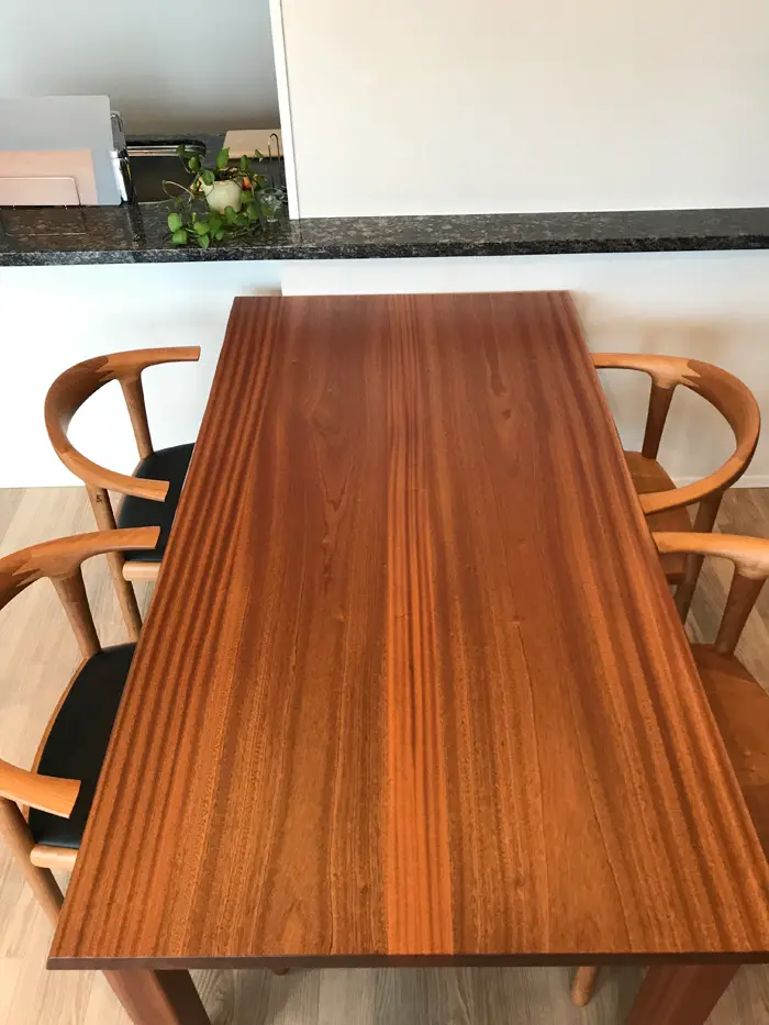今回はそんな気分を吹き飛ばすような木目の表情と色合いが特徴的な「サペリ」のダイニングテーブルをご紹介します。
