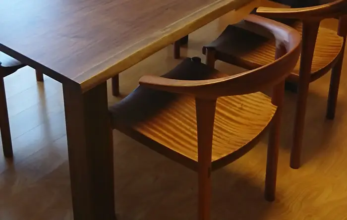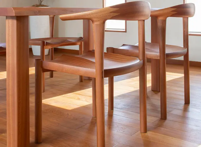 光の角度や陽の入り方で表情を変えるサペリをテーブルに、そのアクセント・引き締め効果としてウォールナットのチェアをもってくることはよくあります。