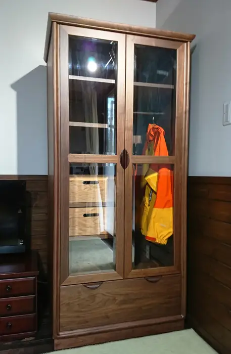 ハンガーバーや大容量の引出し、そしてたってのご希望で製作した無垢材チェリーのボックスがウォールナットの落ち着いた雰囲気の中に華やかな印象とアクセントを加えています。