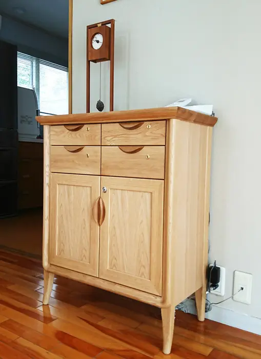 そんな空間にレイアウトする収納家具をご所望いただき、他の家具と同様にナラ材で製作。