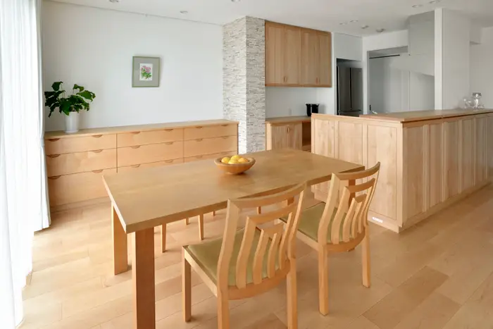 自然光を受けて輝くハードメープルの持つ透明感のある「明るさ」と「清潔感」が家族と長い時間を過ごすその場に相応しいことを、既に近くで一緒に生活してきた家具達が教えてくれていたことが大きな要因です。