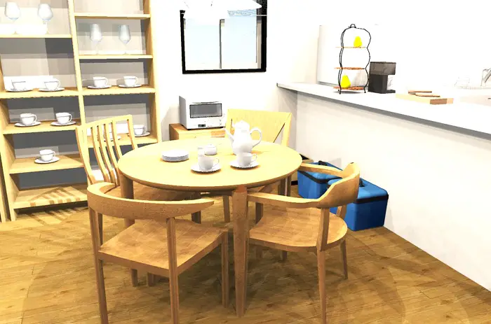 そこで上記の画像のようにお部屋の空間のイメージがわかりやすくなる3Dシミュレーションを作成させていただき、テーブルの大きさや設置後のスペースの取り合いなど様々なプランニングをご提案させていただくなかで、長方形テーブルではなくラウンドテーブルの使い勝手が良いという結論に。