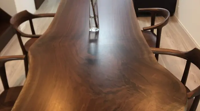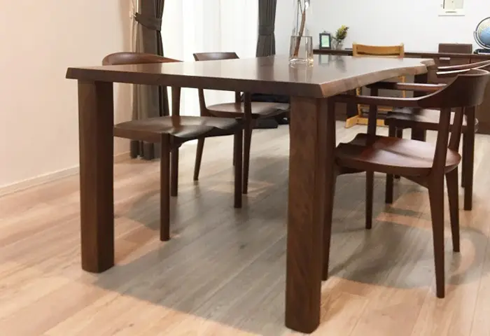 非常に仲の良いご家族で、団欒がより素敵な時間になるように、とご提案させて頂いたそれは、樹齢100年以上の長い年月を生き抜いた大径木の無垢材一枚板で、ウォールナットの力強さと、品の良さを兼ね備えたテーブルです。