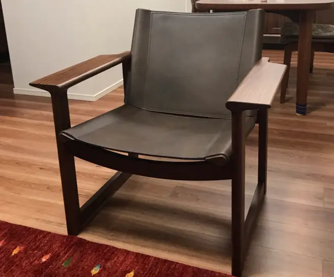 「アームチェアDUO」は、厚みのある最高級のヌメ革を使用していて、革のたわみと木の自然なしなりが、心地よいホールド感を生み出します。