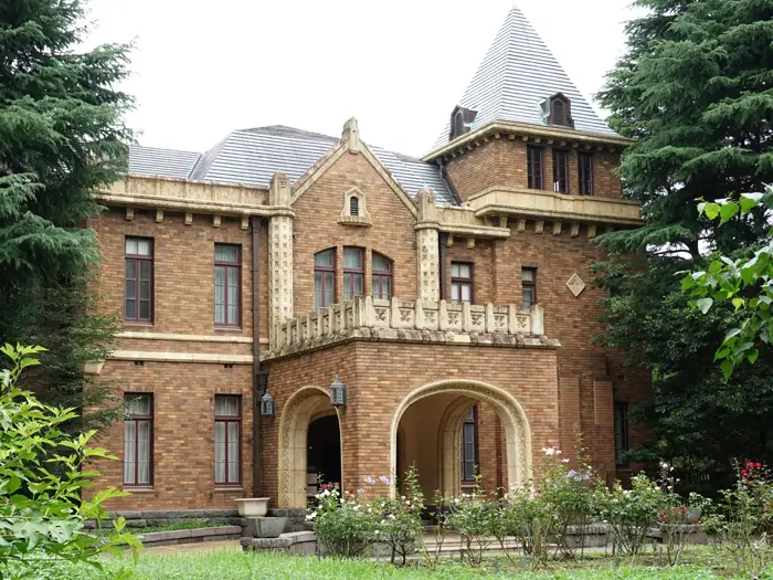 石造りの門を抜けると、生い茂る木々の間から和館が現れ、さらに奥へ進むと、若草色の屋根に赤レンガ張りの洋館がその姿を現します。
