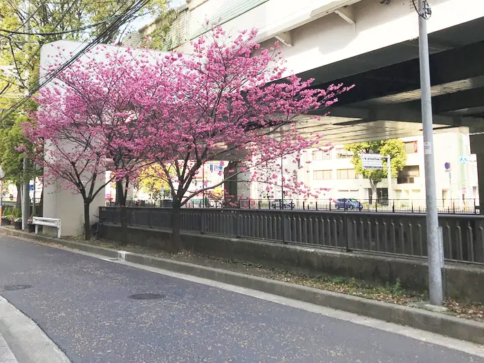 元町ショッピングストリートの横を流れる中村川には3月に入ると様々な花が咲き始めます。