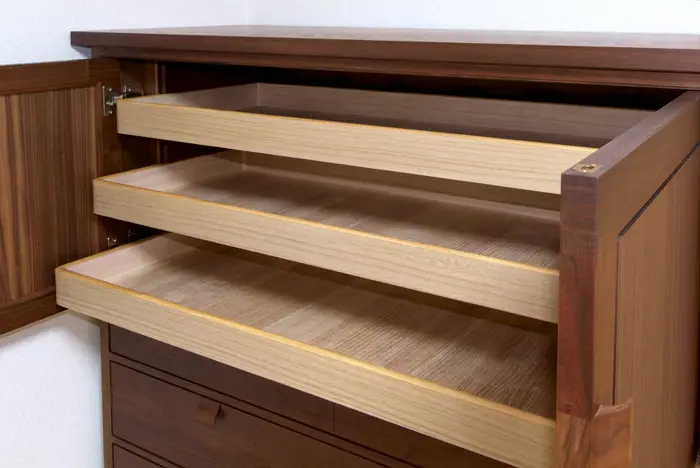 無垢材の桐は他の木材より柔らかいという性質があるため、着物が触れる内部、つまり引出し内部を桐にし、全体は、より耐久性のある無垢材(アメリカンブラックウォールナット、アメリカンチェリー、ナラ、ハードメープル)で作る収納家具が多くなっています。