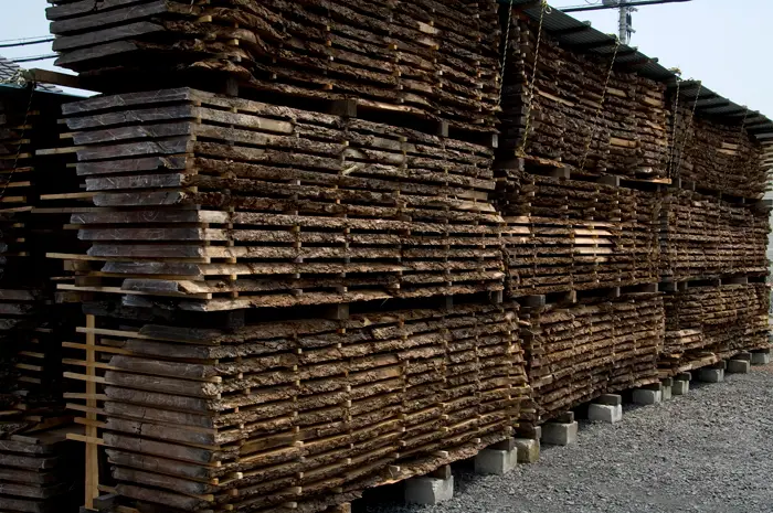含水率が12~13%になるまでゆっくりと自然乾燥させるなかで、この期間は板と板との間に桟棒を入れ積み重ねて保管します。