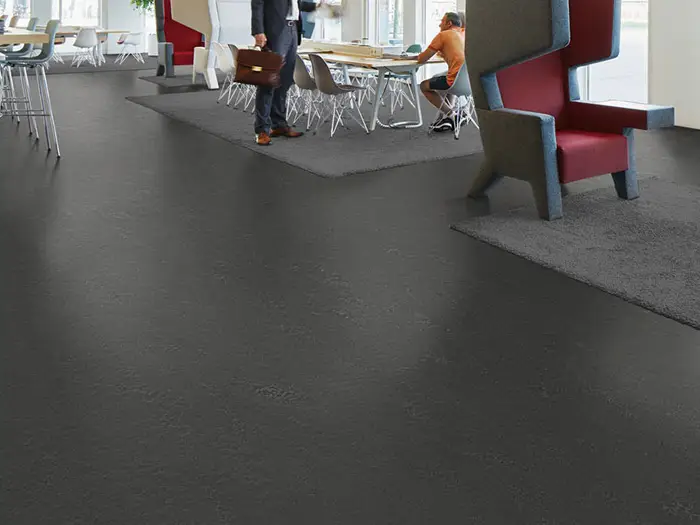 リノリウムが自然素材であるのに対して、こちらは塩ビ素材の特徴を活かし耐久性や意匠性、メンテナンス性を高めている床材です。