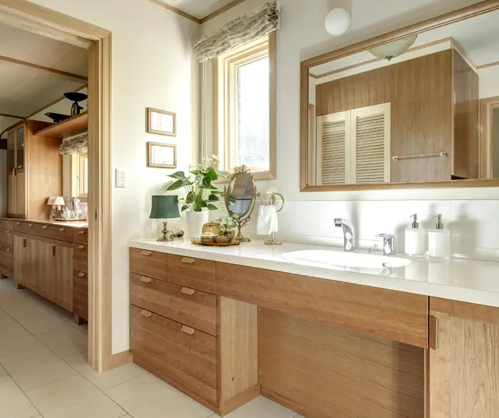 鏡も同じ無垢材でオーダーし、引き戸を開けても絵になるホテルのようにエレガントな空間に仕上がっています。