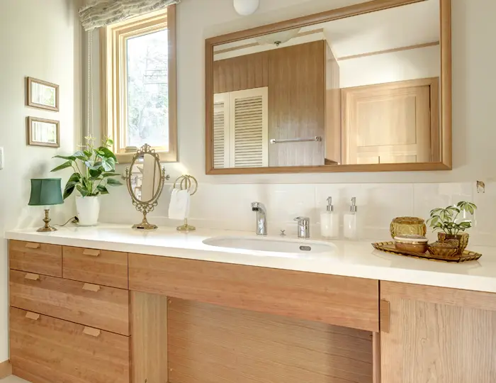 ライムストーンの床でつながる無垢材キッチンとペア設計のパウダールーム。 鏡も同じチェリーの無垢材で製作しました。