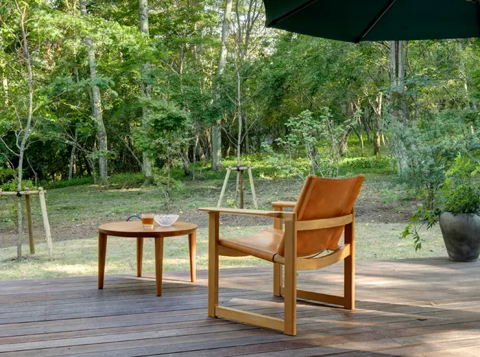 森に囲まれたウッドデッキに、ヌメ革と無垢材を組み合わせた「アームチェア デュオ」が映えています。