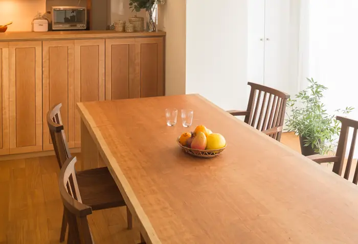 大きなテーブルは食事スペースだけでなく、お子様とのコミュニケーションの場でもあります。 お子様の成長と共に無垢材テーブルも味わい深く変化していくことでしょう。