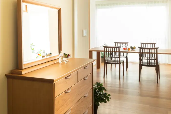 玄関から繋がるリビングの廊下スペースには無垢材チェスト(収納)を配置。