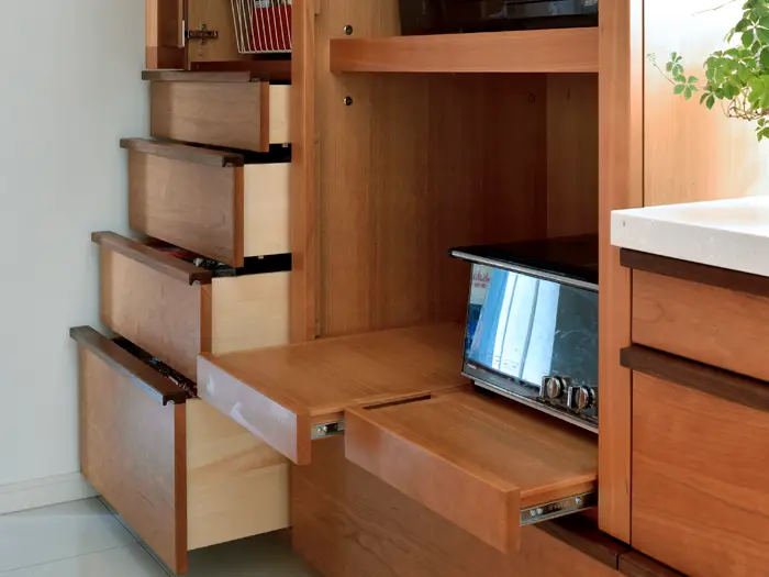 引き出しを加えると常備薬や文具、小物も収納できるので、ダイニングテーブルでお子様が勉強をする、奥様の在宅勤務で使用するなどの際にテーブルの上に物が散乱せず、広々と使うことができます。
