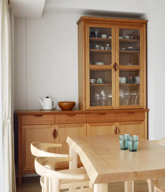 壁面に大きな面積を占めるこの家具は、例えばガラス面を多くしてチェリー材の持つ華やかさとともに美しく演出してもいいですし、その温かみのある色合いから壁面を埋めても圧迫感を与えることはありません。