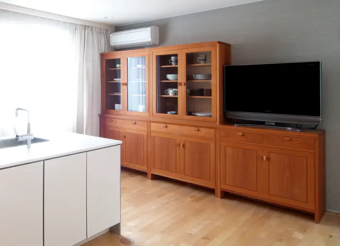 収納を兼ねてテレビが設置できること、また基本的にはダイニングからの視聴距離を短く設定する場合が多いため、狭いスペースでも有効活用できる利点があります。