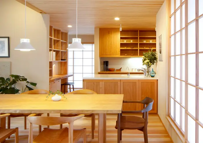 部屋に入ると必ず目に入るのがキッチンであり、主婦だけではなく家族皆で使う共有の場となっています。