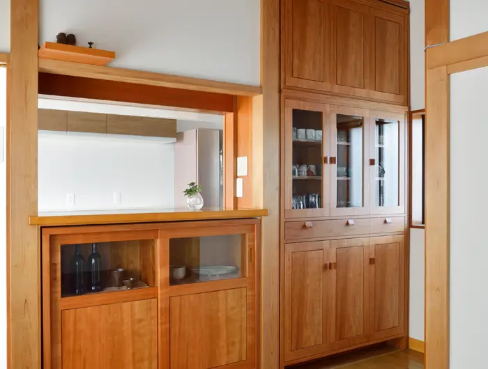 開き戸は大きな食器の出し入れや、観音扉(2枚扉)であれば開口が広いため、収納されているモノを見通しやすいという良さがあります。