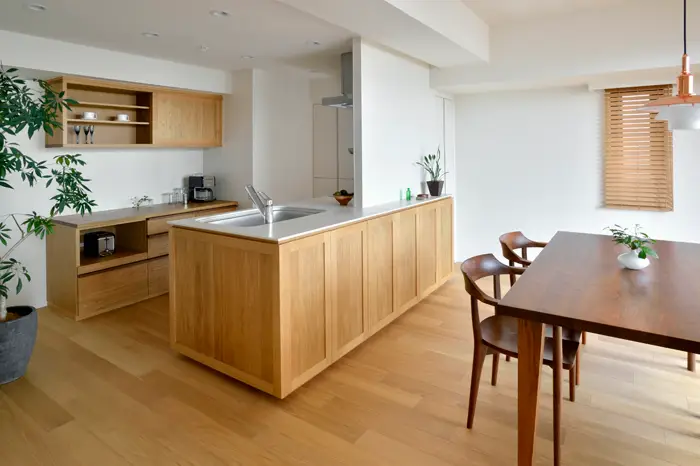 写真のケースでは、LDKの入り口がキッチンの脇にあり空間に入ってまず見える部分がキッチンの横顔だったため、サイドのパネルを印象的な羽目板仕様にして無垢材の質感をより濃く感じられる設えにしています。
