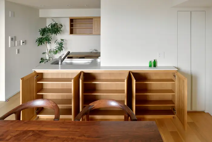 そのためダイニング側に3スパン並んだ両開きの収納は、左側の1スパンとそれ以外で奥行を変えて作る必要があるため、その部分は既成サイズではなく特注にすることで収納スペースを有効に設けています。