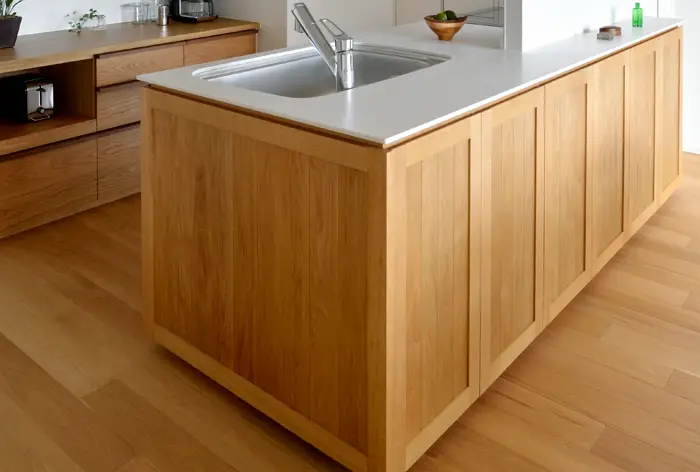 空間全てでないとしても家族が集まるダイニングテーブルやダイニングチェアを無垢材で、ということになるとその近くにあるキッチンもやはり、木のもの・無垢材であると統一感がさらに増してきます。