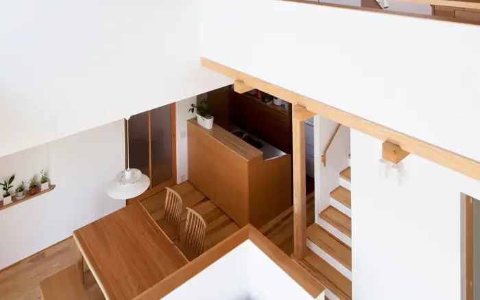 広い空間をさらに開放的にする吹き抜けを採用しながら、スキップフロアなどのアクセントで生活の場にも軽やかなメリハリをつけています。