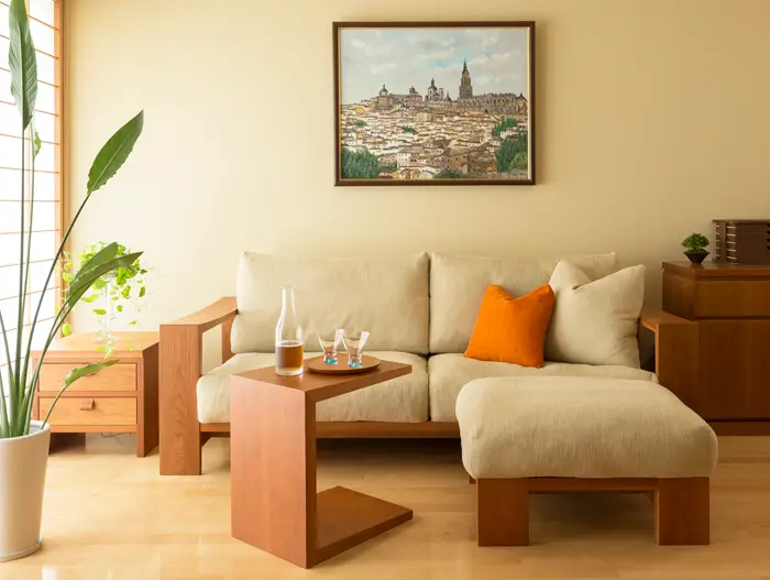 「ソファ モデルノ」にはオットマンを合わせ、足を伸ばして寛げる仕様に。壁には同じ建築家だったご主人のお父様が描かれた絵画が。「ナイトテーブル モデルノ」はソファ横の「サイドテーブル」として便利に使用しているそうです。