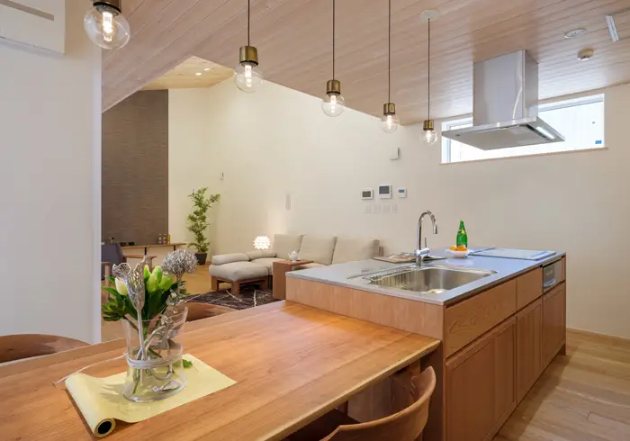 またマンションなどの限られた空間であっても、対面キッチンに対して垂直にテーブルを合わせることで、同じような効果を得ることができます。