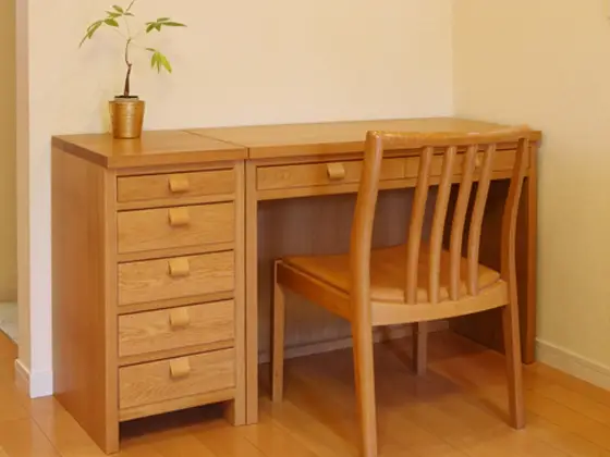 私ども家具蔵では、オリジナルの無垢材デスクを多様なデザインでオーダー製作しており、合わせる椅子の丁度良い高さやデザイン、場合によっては購入の要不要までアドバイスを行います。