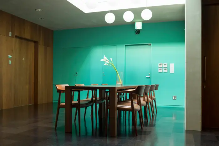 同じ無垢材でも雰囲気を変えるため、窓に面したラウンジでは赤い壁の前に明るい色のメープル材、シックな緑色の壁の「森のホール」には落ち着きのあるウォールナット材が選ばれるなど、空間の性格に合わせて丁寧に樹種が選ばれました。