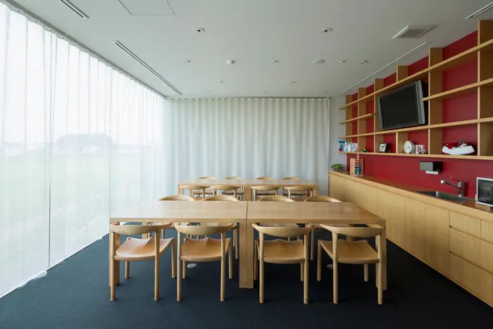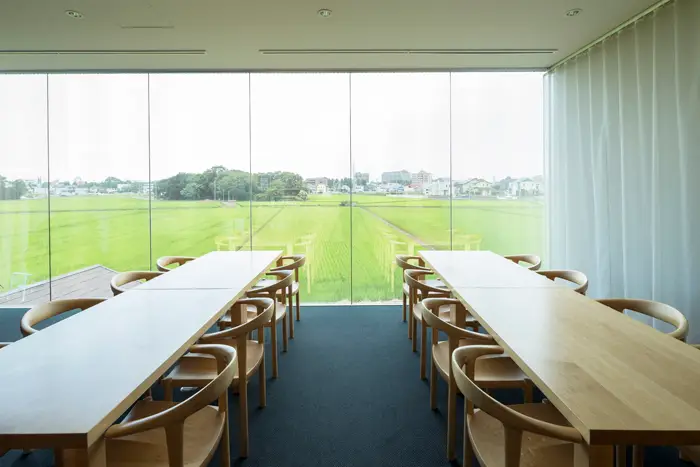 ラウンジから一望する田んぼと住宅の入り混じる風景が「筑波らしくて大好き」と院長が嬉しそうにお話されました。ガラスはマジックミラーになっていて、授乳していても外からは見えないようになっています。