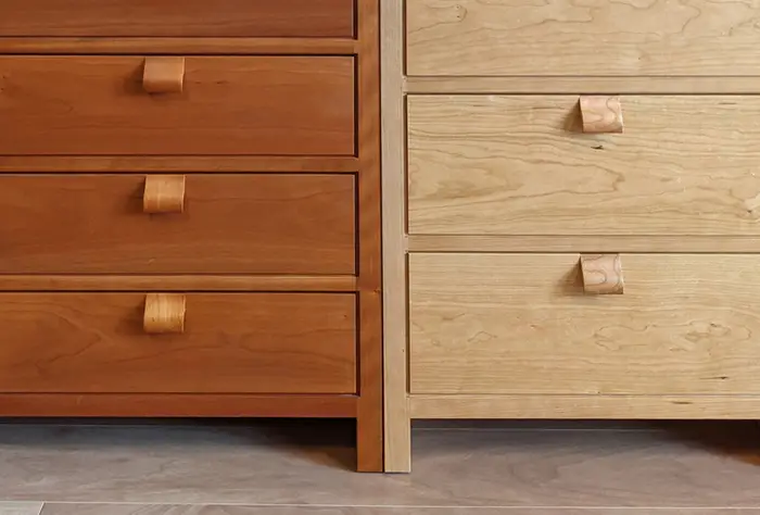 チェリー材は特に経年変化が大きく、はじめはほんのり赤いくらいの色味が徐々に濃く変化します。