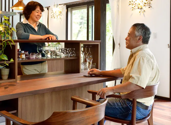 キッチンやキッチンスペースをプランする場合はリビングダイニングの家具と同じように捉え、単に「設備を考える」という範疇にとどまらず、自分の趣味、趣向を反映した「家具」としてスタートしましょう。対面式キッチンにも木の要素を取り込み、家具のようなキッチンでLDと併せてトータルに計画したいものです。