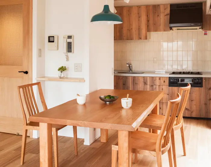無垢のチェリー材を使った「無垢材ダイニングテーブルカーム」と「無垢材チェアレスタ」を中心にして構成されたダイニングスペース。