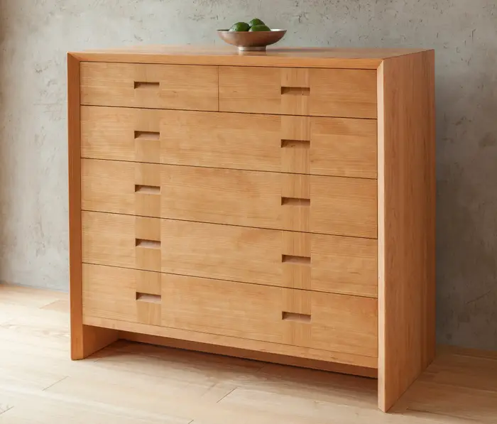 左官仕上げの壁面が、そのニュアンスのある表情で「無垢材チェストダン」のモダンなフォルムと精緻な手仕事をひきたてています。