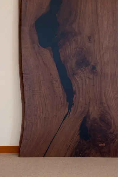 一枚板天板の欠けている部分に樹脂を流しこんで作るテーブルを「樹脂埋めテーブル」あるいは「リバーテーブル」と呼んでいます。