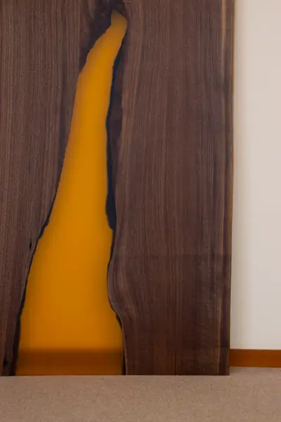 大きな節穴、あるいは長尺に欠けた部分を樹脂で埋め込み、家具として使い勝手の良いものに仕上げます。