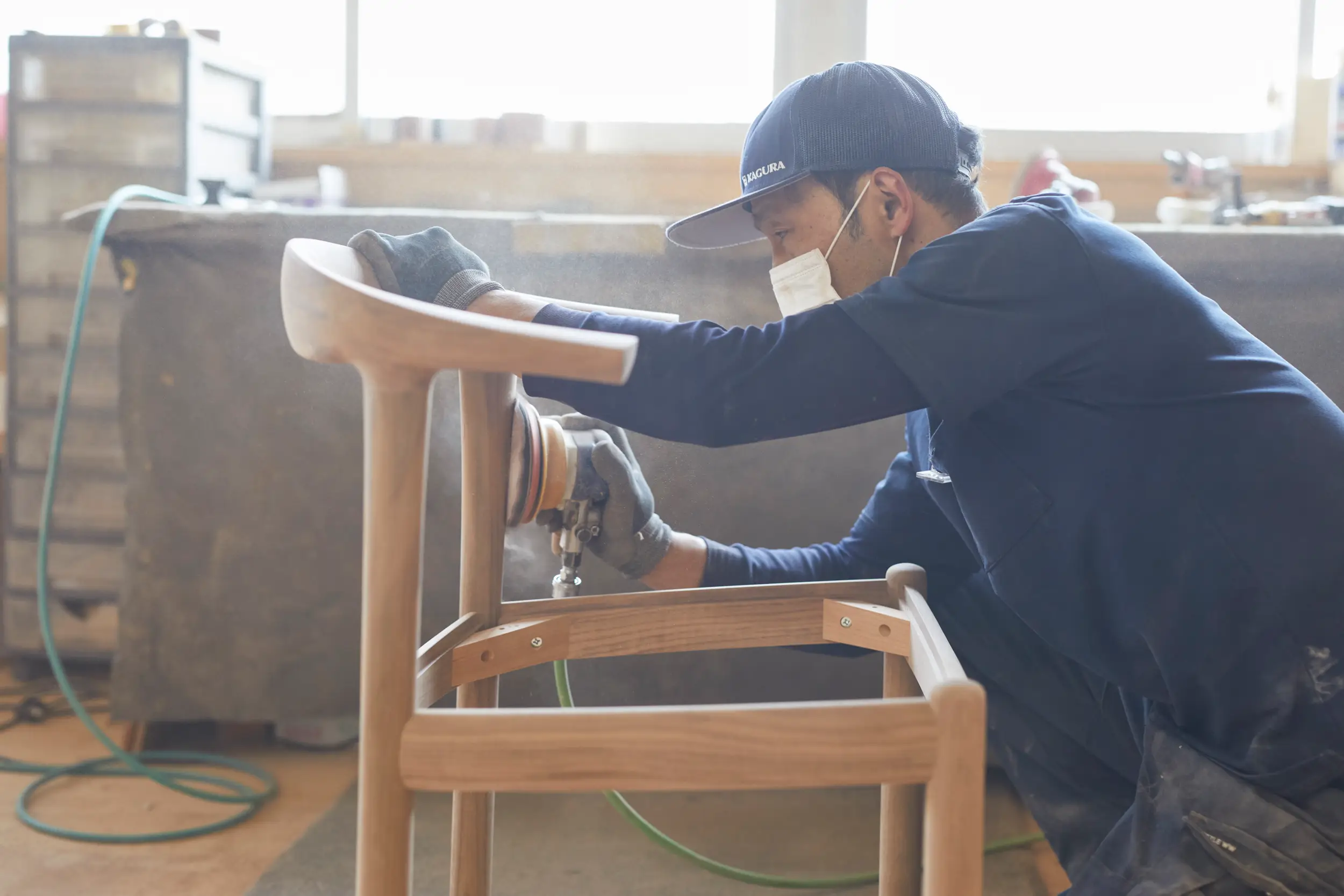 KAGURAの無垢材チェアはパーツの切り出し、大まかな面取りなどの部分には機械加工も取り入れ加工効率をアップさせながら日本が誇る伝統の木造建築の工法を家具作りに活かしています。