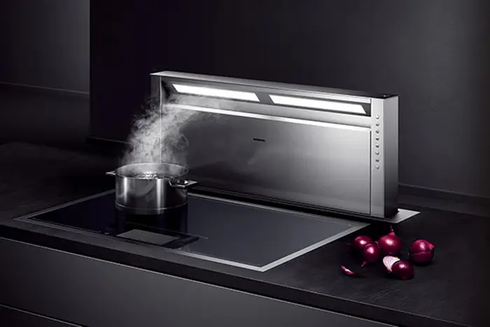 天井や壁取付けではなくワークトップに取付けるタイプで、使う時だけボタン一つでワークトップから出てくる仕様は、工業製品に強いドイツならでは。