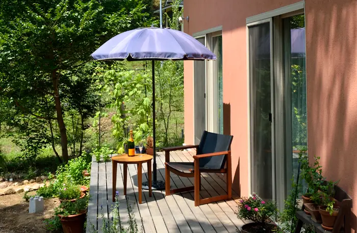 ウッドデッキに「無垢材アームチェアDUO」を出して「昼間から飲むお酒は最高ですね」というご主人。
