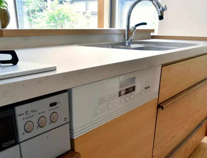 背面カウンターは高さを敢えて700mmと低めにしたことで、食堂側からキッチン家電などが丸見えになるのを避け、先述の家事用デスクに合わせた椅子に座っても丁度いい高さとなっています。
