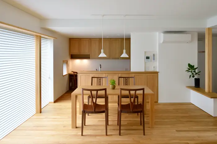 室内は、白いファブリックブラインドから自然光があふれ、北海道産ミズナラ材の無垢材のキッチンや同じくオーク無垢の床をやさしく照らしています。