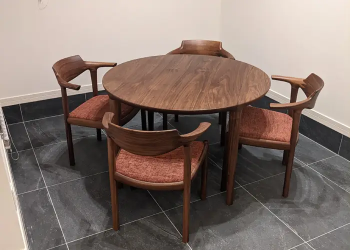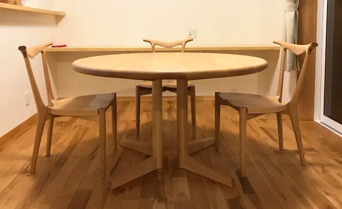また、必然的に椅子を収納する位置は決まるので、座る位置を限定したくない、あるいは4人掛けだが詰めて5人座ることもある(ラウンドテーブルはその点でも柔軟に使用しやすい)という場合は次にお話しする1本脚や中央脚のほうが良いかもしれません。