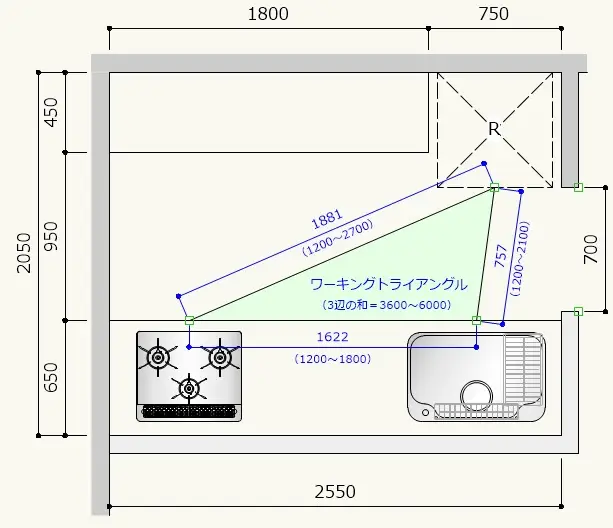 ここで言う「程よいバランス=距離」とは「シンクとクックトップの距離=1200~1800ミリ」「クックトップと冷蔵庫の距離=1200~2700ミリ」「冷蔵庫とシンクの距離は、1200~2100ミリ」であり、そしてその合計が「3600~6000ミリ」というのが理想です。