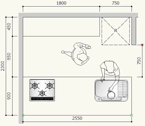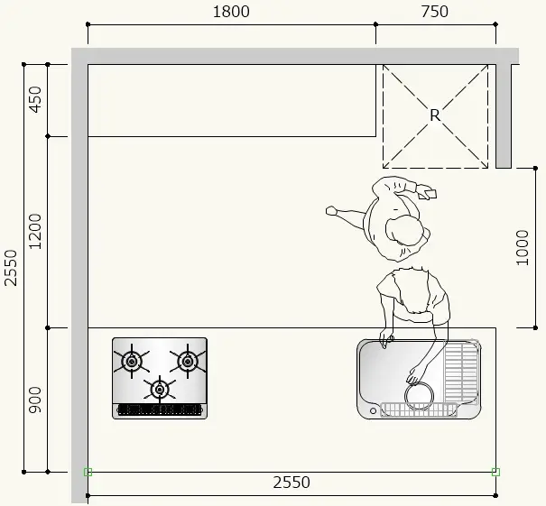 現代では非常に多くなっている対面型キッチンで幅は2550ミリという標準的なサイズで考えた場合の図面がこちらです。
