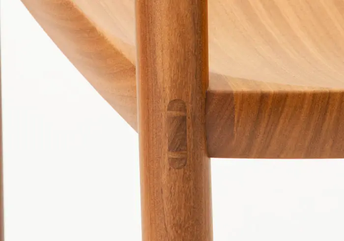 立ち座りの際に力を受けとめ、椅子の構造の中でも最も強度が必要とされているのが、台輪と脚の接合部分であり、ここに「込み栓」の技術を応用した加工が施されています。