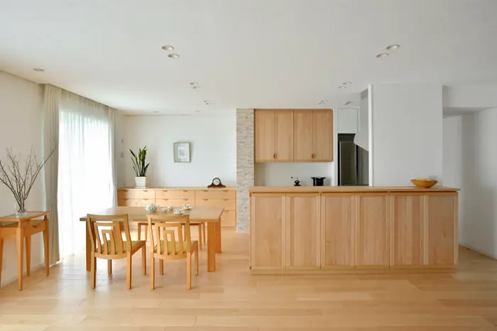 オーダーキッチンとオーダー収納を同じ樹種で製作し、施工する。