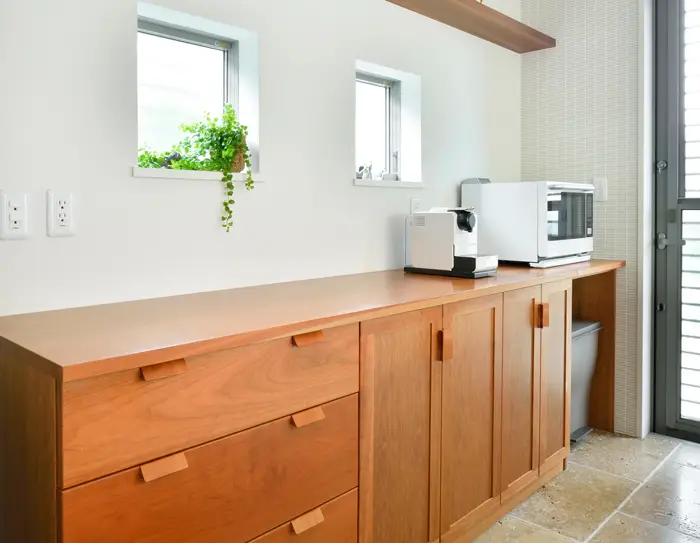 キッチン後ろのカウンターは、家具蔵の無垢材収納シリーズ「ユニットボード プログレス」で製作しています。